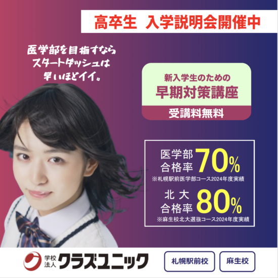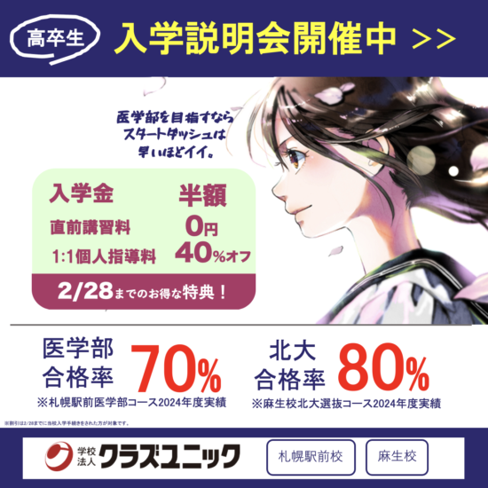 クラズユニックには「麻生本校」、「円山校」、「札幌駅前校」がございます。各校の特色があり、貴方に合わせた合格までの環境を揃えます。