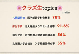山谷 ひかるさん(札幌北高校)私は浪人する時に文転したのですが、最初の頃は勉強の仕方が分からず、模試でも良い点数が取れませんでした。しかし、各教科の先生に勉強法を質問して、予習で分からない所をチェックして、授業と復習で理解して、少しでも分からない所は質問に行って、解き方が覚えられるまで復習を繰り返すことで得点を伸ばすことができました。お世話になった先生方、教務・用務の方々、一年間ありがとうござい