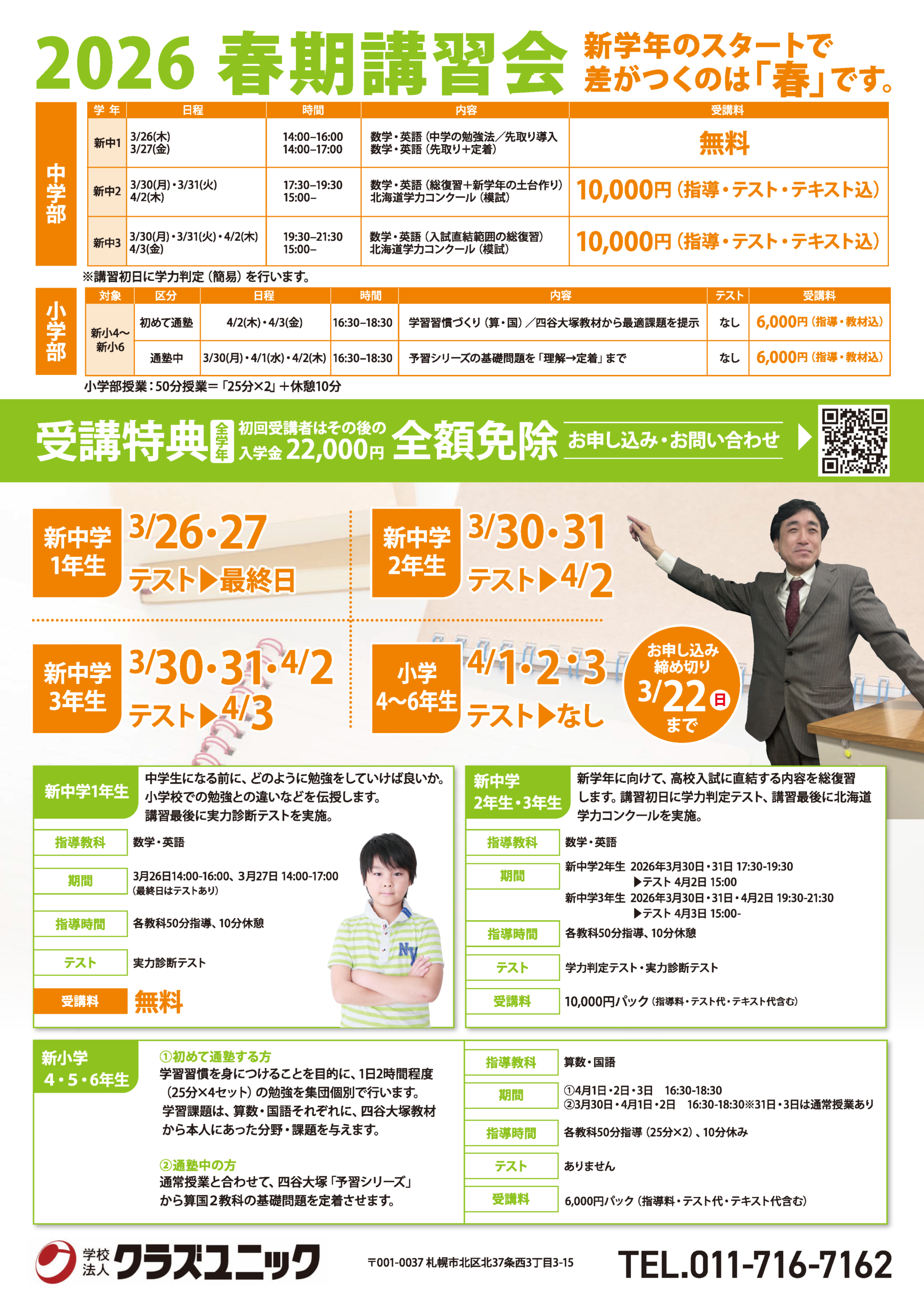 - 【春期講習からの継続特典】: 入学金 22,000円を全額免除!